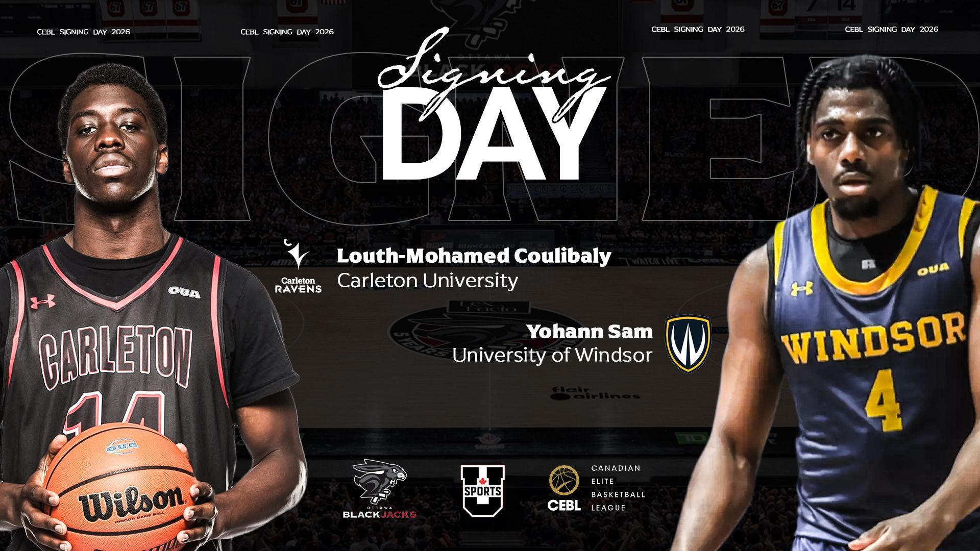OTTAWA, ON, April 8, 2026 – The Ottawa BlackJacks have added two Canadian student-athletes to their 2026 roster as part of the Canadian Elite Basketball League’s inaugural Signing Day, signing guard Yohann Sam and center Louth-Mohamed Coulibaly. Announced by the CEBL on March 26th, Signing Day replaces the league’s previous draft format and marks the next evolution of the CEBL’s partnership with U SPORTS, creating a direct pathway for Canadian student-athletes to transition from the collegiate ranks to the professional game. Sam joins the BlackJacks after a standout collegiate career at the University of Windsor, where the 6-foot-5 guard spent four seasons developing into one of the OUA’s top offensive threats. The Brampton, Ont. native was selected second overall in the 2025 CEBL Draft and made four appearances during the 2025 season with the Brampton Honey Badgers. Sam earned OUA Third Team All-Star honours in 2025 and recently completed his third consecutive university season averaging at least 15 points per game. He also represented Canada internationally during the summer of 2025 as a member of the Canada U23 FIBA 3x3 National Team. “Yohann is a versatile, polished scorer from all three levels,” said Ottawa BlackJacks General Manager James Derouin. “His previous CEBL and Canada Basketball experience speak to his high-level ability and willingness to take on new challenges. We are excited to have him in the mix and work with him this summer on further developing his game at the pro level.” Coulibaly joins Ottawa following a championship-winning season at Carleton University, helping the Ravens capture their 18th national title. The 6-foot-9 center completed his collegiate career after previous NCAA Division I stops at Holy Cross and Valparaiso. Raised in Ottawa, Coulibaly is a product of the Canada Topflight Academy prep program and appeared in 70 NCAA Division I games before returning home for his final collegiate season. In 2026, he finished among the top five nationally in total rebounds during the U SPORTS season and recorded 13 games with 10 or more rebounds. “Louth-Mohamed is a true competitor and a versatile modern big man who showed his winning impact this season, helping the Ravens take home the National Championship,” said Derouin. “Allowing local players to make the jump to the professional level is an important part of our team’s history, and we are thrilled to continue that trend as Louth-Mohamed starts his pro journey with us.” The BlackJacks continue preparations for the 2026 Canadian Elite Basketball League season, tipping off this spring at The Arena at TD Place. Single tickets are currently available to purchase by visiting theblackjacks.ca/tickets . BlackJacks 2026 season-seat memberships are available now. For additional details, fans are encouraged to email ticketing@theblackjacks.ca or call 613-294-1133. Interact with us on social media: Instagram: ottawablackjacks X: Ott_BlackJacks Facebook: OttawaBlackJacks TikTok: ottawablackjacks